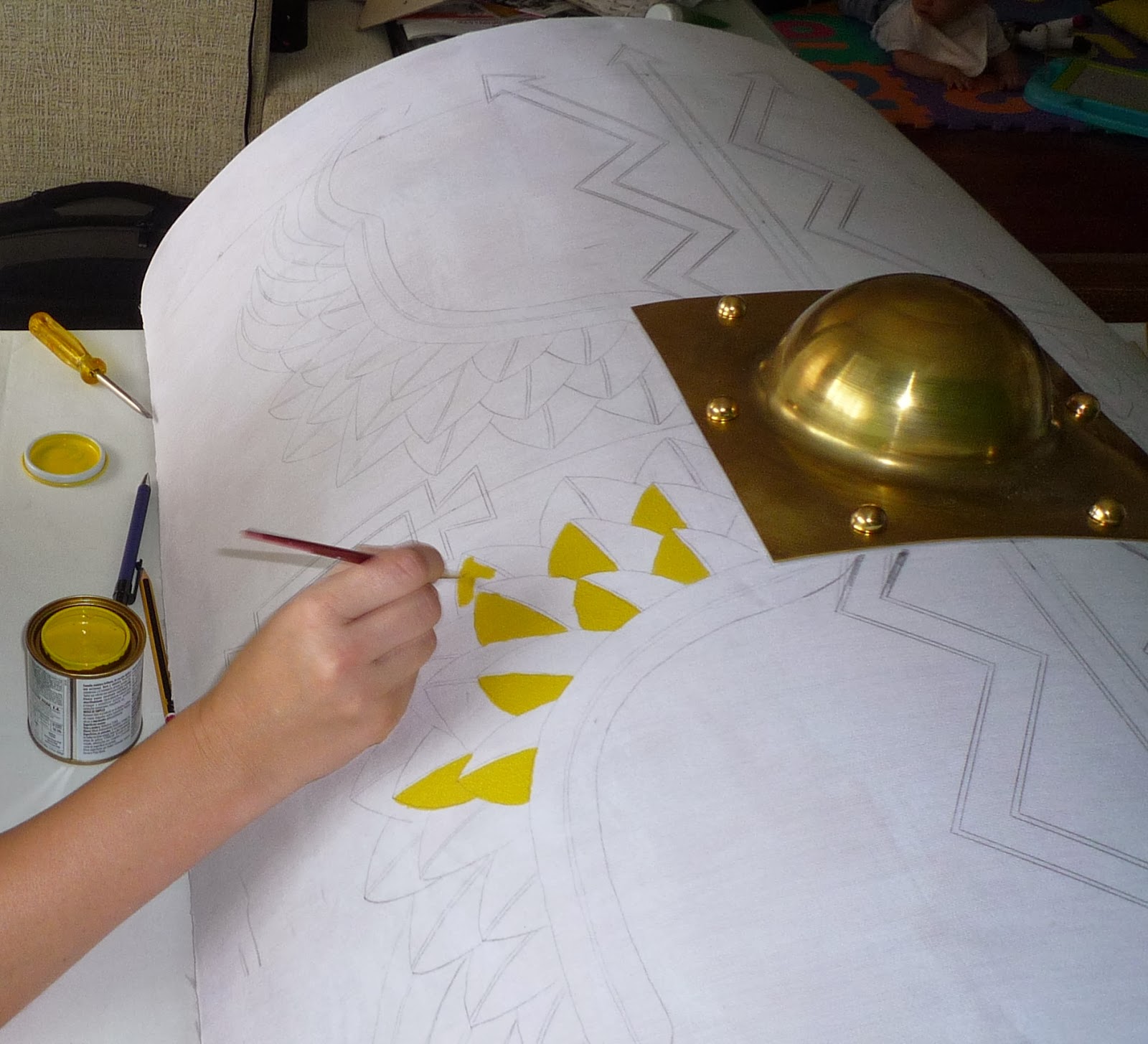 Una vez que ya tenemos dibujado el emblema, ahora sólo queda darle el color. Yo utilicé la acrílica de toda la vida. Para ello empecé primero por los colores más claros, seguidos por los más oscuros. Terminado el emblema (alas, flechas y marcos), se pasa a dar color al resto del scutum con el rojo.