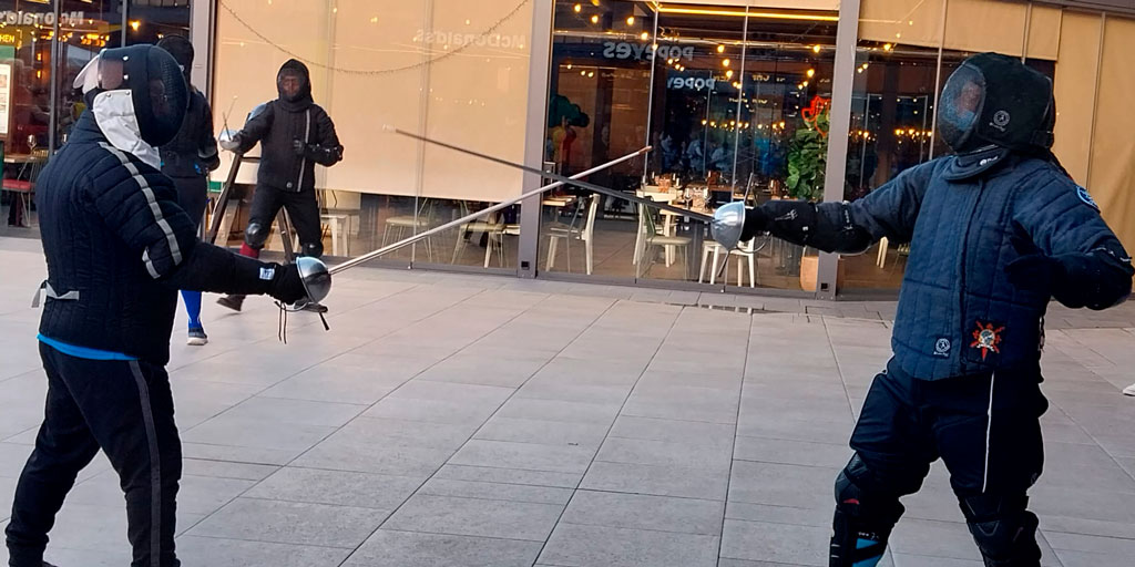 Con el público animado, pasamos a la exhibición de los adultos y subimos una marcha: repetimos el cuadrado de Meyer ya con espadas largas de metal y a un ritmo más vivo. Añadí tres técnicas de la tradición de Johannes Liechtenauer (Abnehmen, Absetzen y Zwerchhau) para que se percibiera la lógica del sistema. Los asaltos que siguieron fueron limpios y expresivos; se notaba la técnica en los combates de este noble arte y el respeto por el compañero.