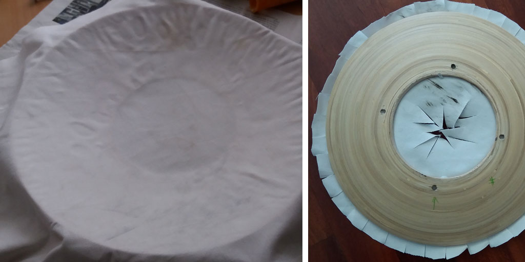 Luego tomaremos la tela y la estiraremos sobre el plato. Hecho esto, cortaremos radialmente la parte central del plato, donde coincide con el agujero, y empezaremos a presionar con los dedos sin parar, para eliminar cualquier bolsa de aire y/o pegamento que quede.