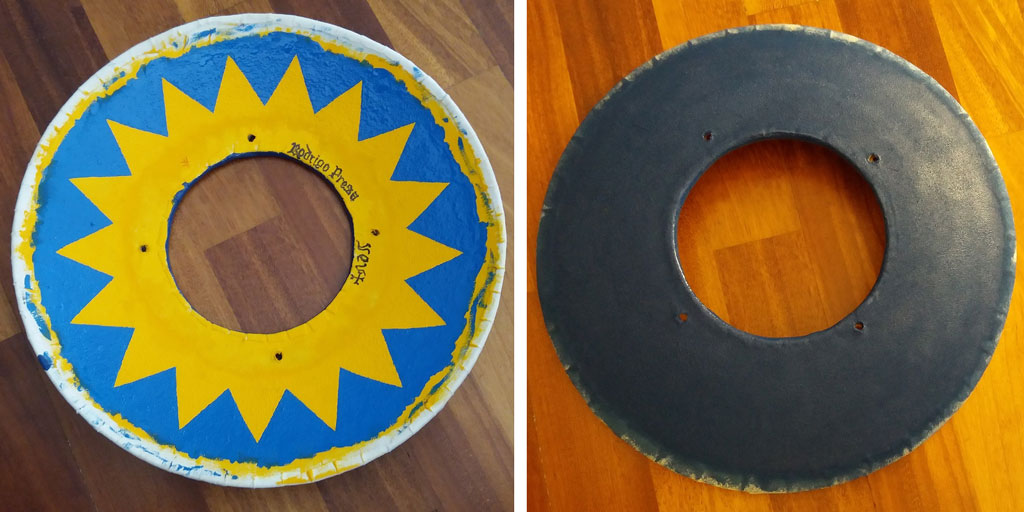 En el siguiente paso podemos decorar el broquel como gustemos. Yo me he decantado por un motivo geométrico usando sólo dos colores. Luego, por detrás, ya lo he pintado de un solo color. Para ello he utilizado pintura acrílica. A continuación unas fotos del proceso: