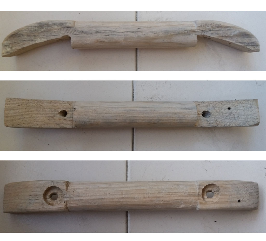 Al aluminio, en la parte central donde van a ir pegados los trozos de madera, les he practicado unos agujeros (4-6) de unos 6 mm de diámetro para que la cola blanca entre en contacto entre los dos trozos de madera y darle más solidez. Una vez que esté seco el conjunto, y con ayuda de la lima al principio, y posteriormente con papel de lija, le vamos terminando de dar la forma redondeada. Por último, podemos dejarlo así, barnizarlo, encordarlo, meterle un trozo de cuero,…