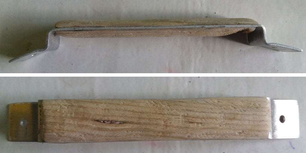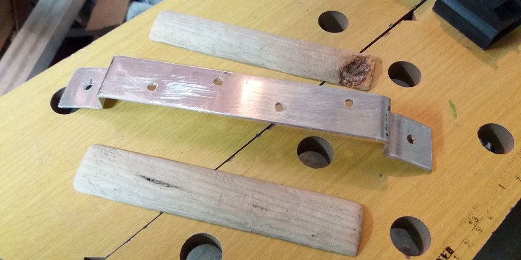 Para este otro tipo, he cortado una tira de aluminio de unos 28 mm de ancho por 20 cm de largo. Los extremos los he plegado un ángulo para que se adaptase a la inclinación del plato. Luego se cortan dos trozos de madera para el asa, de longitud el diámetro practicado en el plato y, con ayuda de una lima, redondeamos longitudinalmente sus cantos.