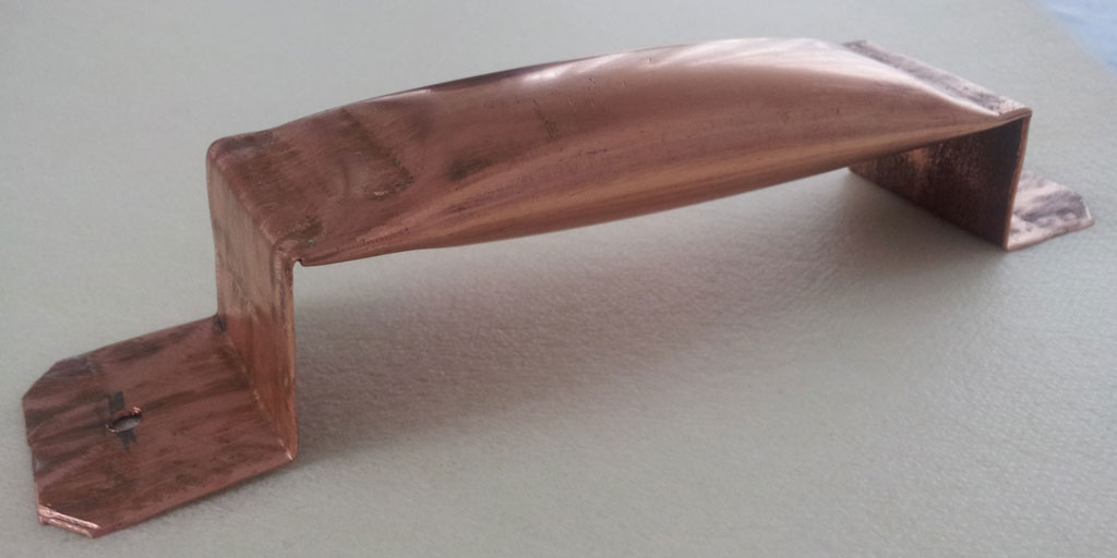 Para este otro tipo de asa he usado un trozo de tubo de cobre al que le he dado forma a base de martillazos y tornillo de mesa. Se corta un trozo de tubo de unos 20 cm y se aplasta los extremos dejando sin aplastar el equivalente al diámetro del agujero del plato. Se dan un par de dobleces a la parte aplastada y se realizan los correspondientes agujeros para asirlo al plato.
