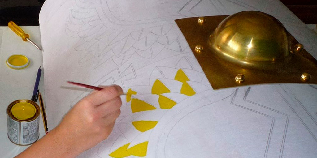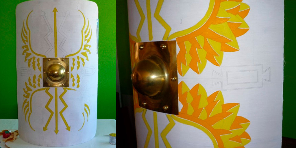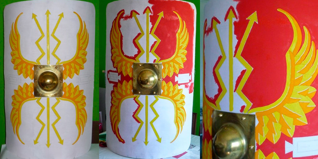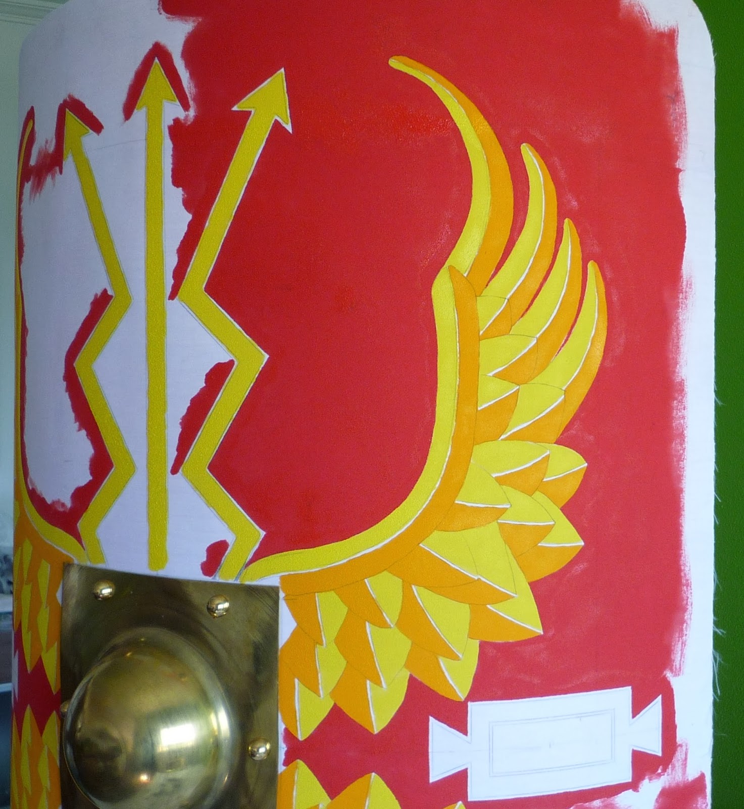 Una vez que ya tenemos dibujado el emblema, ahora sólo queda darle el color. Yo utilicé la acrílica de toda la vida. Para ello empecé primero por los colores más claros, seguidos por los más oscuros. Terminado el emblema (alas, flechas y marcos), se pasa a dar color al resto del scutum con el rojo.