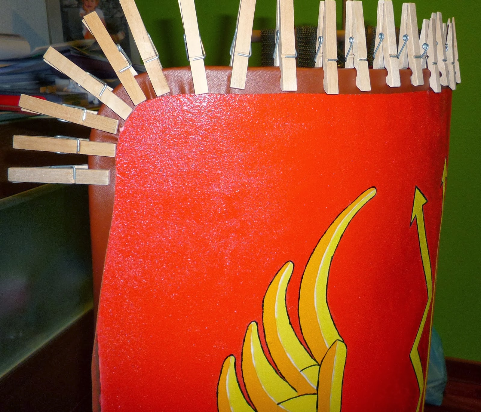 Corté tiras largas, de un ancho apropiado, y con la misma cola blanca las fui pegando. Para sujetarlas usé pinzas para la ropa.