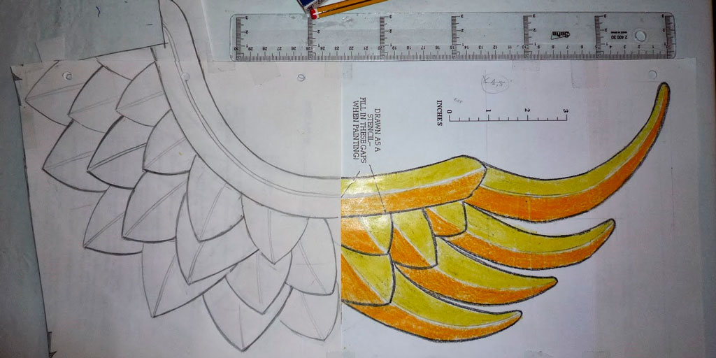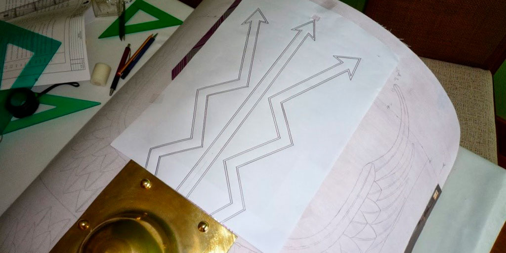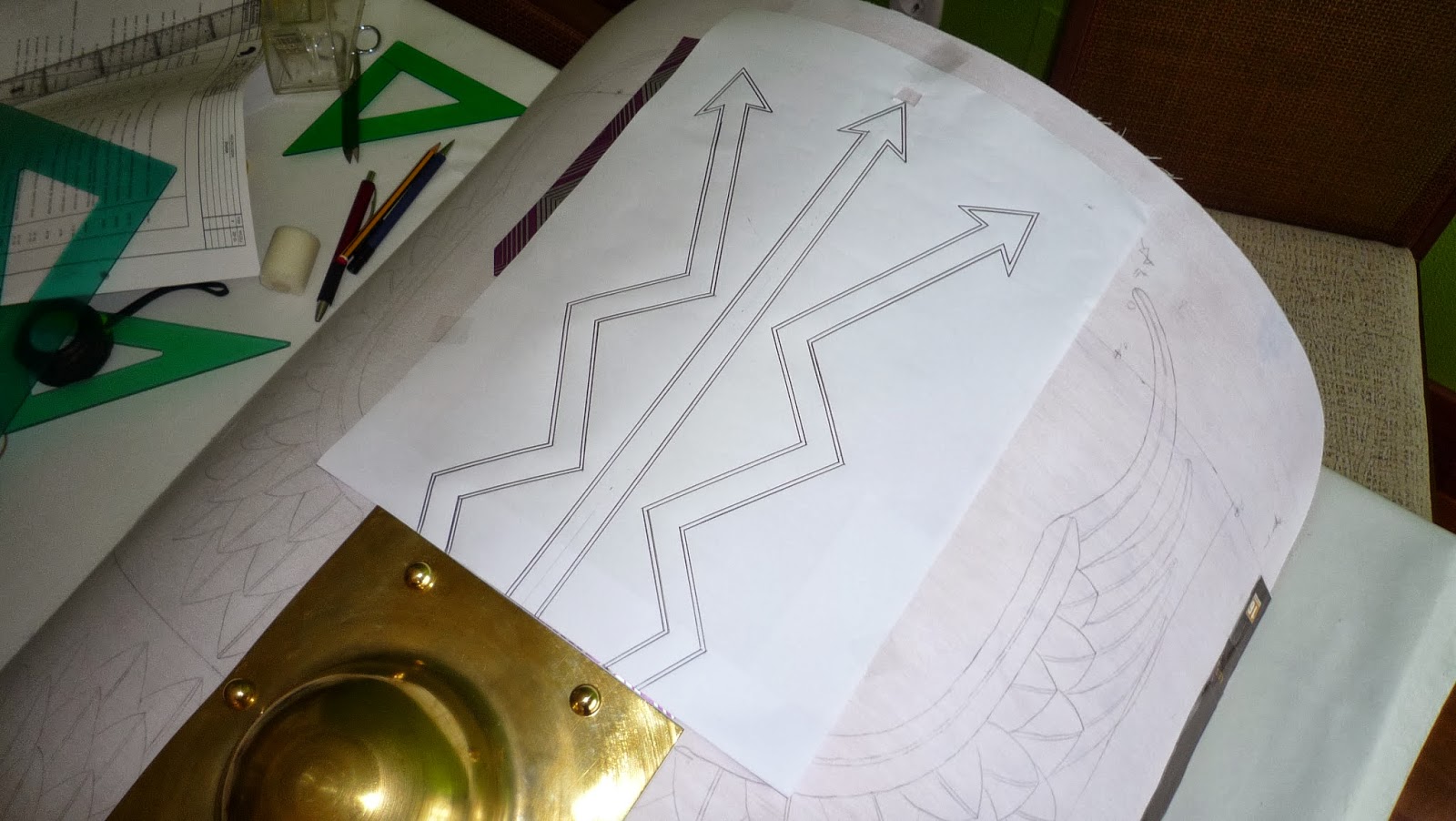 Para saber cómo quedaba realmente lo pegué al scutum y calculé el ángulo necesario para que me cupiesen las flechas y el marco. Una vez elegido el lugar idóneo, deslicé papel de calco por debajo de la plantilla y traspasé el dibujo al scutum. De igual forma lo hice para las otras partes.