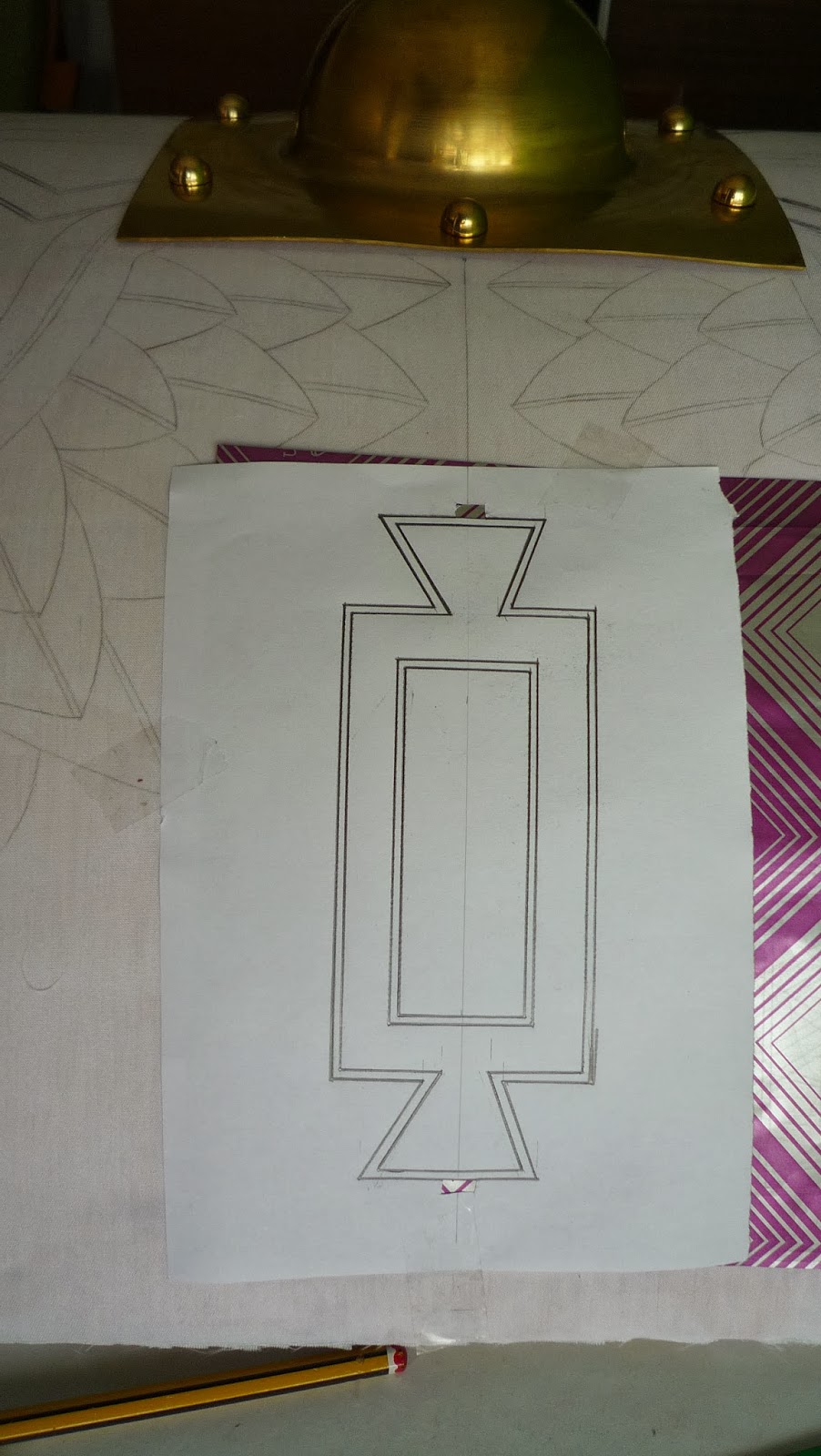 En el caso de las flechas y los dos marcos hice igual, dibujar el boceto, posicionarlo, y aplicarlo sobre el scutum con papel de calco. Estos, al componerse de rectas, son más fáciles de dibujar (para ello lo mejor es usar la clásica regla).