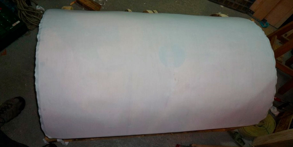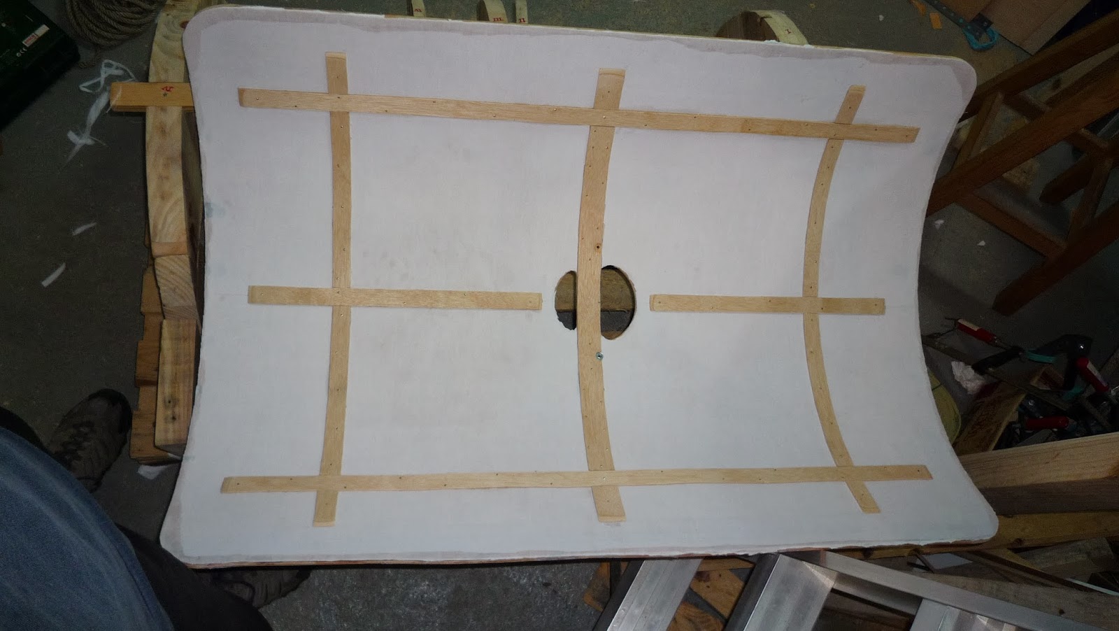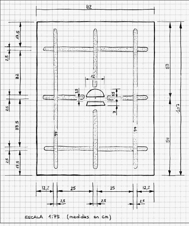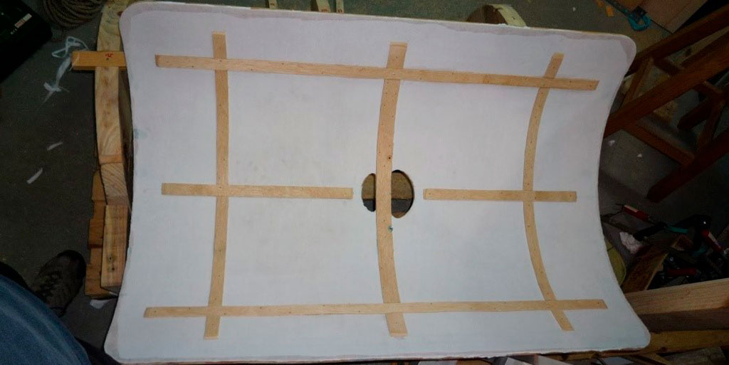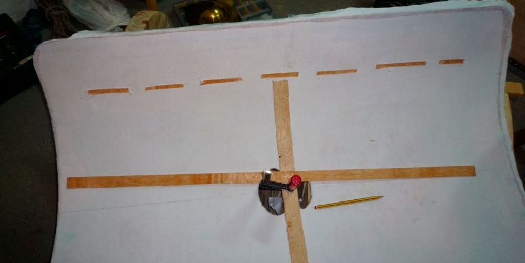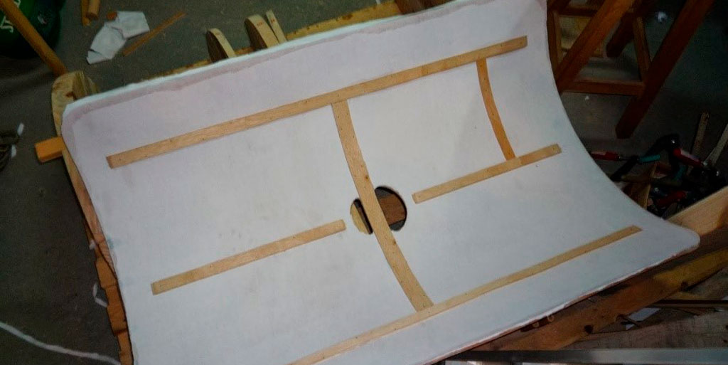 Es por ello que opté por la siguiente solución: una vez pegada la tela, y con ayuda de un cúter, fui cortando tiras de tela más estrechas que los refuerzos de madera allí donde iban a ser pegados. La disposición de estos refuerzos es la siguiente: