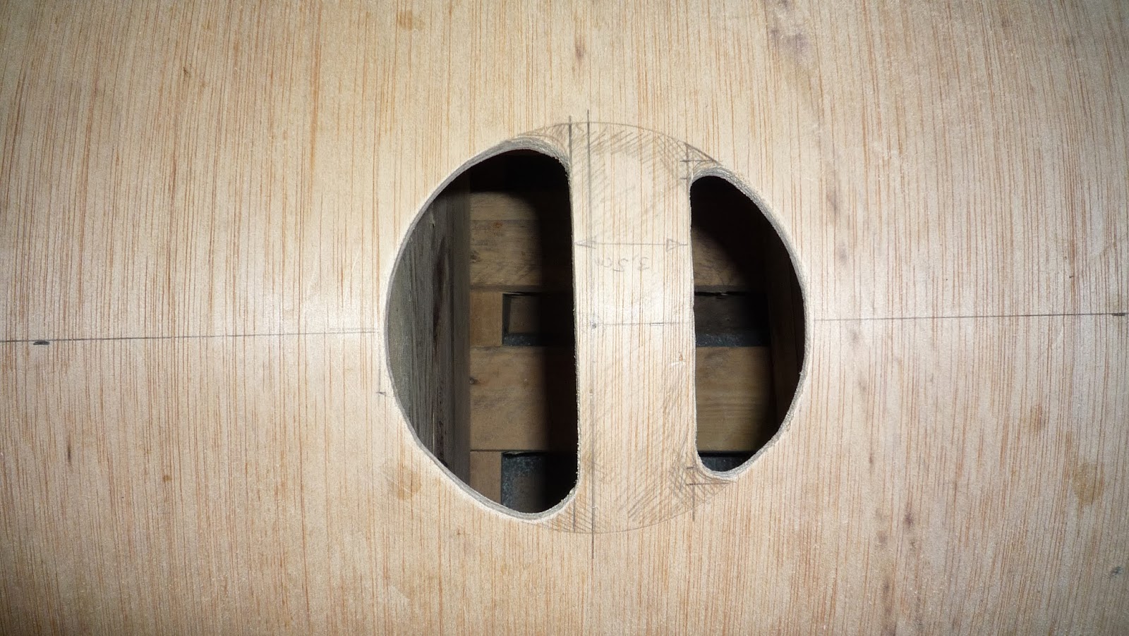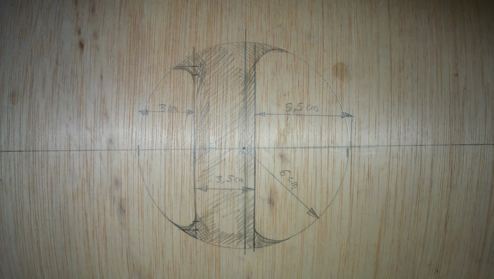 A continuación, «recortaremos» en la parte central un par de agujeros, para así crear el asa con la que sujetaremos el scutum. Yo le he dado las siguientes medidas (ver fotografía), suficientes para meter mi mano y que esta quede oculta por el umbo que posteriormente colocaremos. La parte de 5,5 cm correspondería a la posición de los nudillos de la mano.