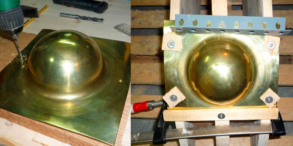 El umbo que tenemos, de base cuadrada, tiene que adaptarse a la curvatura del scutum, por lo que antes de colocarlo, lo que hice fue perforarlo con un taladro para crear los agujeros equidistantes por donde pasaría los tornillos, e ir atornillándolo a tres de las «costillas» del armazón para que fuese doblando. Si hiciese esto contra la plancha de contrachapado de 9 mm, esta acabaría cediendo, ya que el latón junto con la semiesfera se hace difícil doblarlo. Los tornillos que uso tienen «trampa»; son verdaderamente tornillos a los que luego se les enrosca un embellecedor, por lo que desde fuera parecen clavos remachados (lógicamente se pueden elegir otras formas de fijarlo).