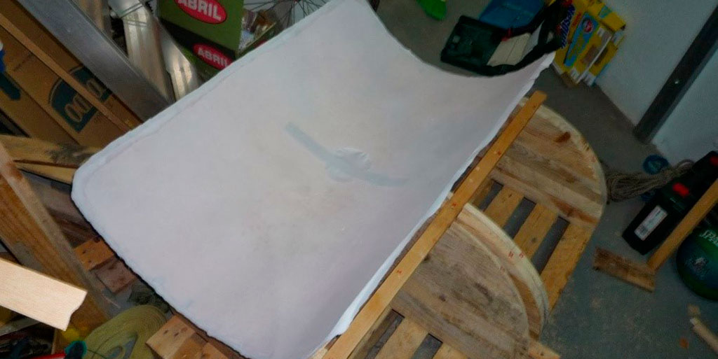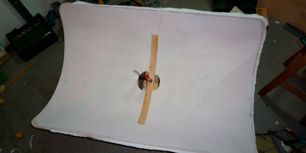 Una vez que ya tengo las planchas de contrachapado pegadas y con la forma curvada que le hace tan característico (ver tutorial de cómo curvar planchas a partir de un prensa), pasamos a cortarla para obtener un «rectángulo» de 107×82 cm. Lógicamente, estás medidas pueden adaptarse, pero son las que yo usé.