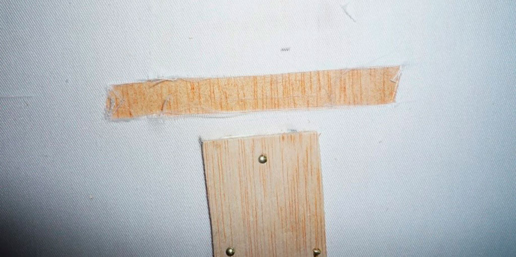 Y la forma de ir cortando las tiras de tela e ir pegando laos refuerzos lo ilustro con las siguientes imágenes. En la primera de ellas se puede ver los 7 recortes de la tela que hice en una de ellas y luego el refuerzo de madera pegado encima. Así dichos refuerzos van pegados directamente a la madera.